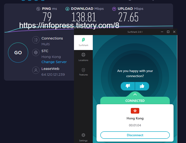 SurfShark VPN 홍콩 속도 : 핑 79ms / 다운로드 : 138.81Mbps / 업로드 27.65Mbps