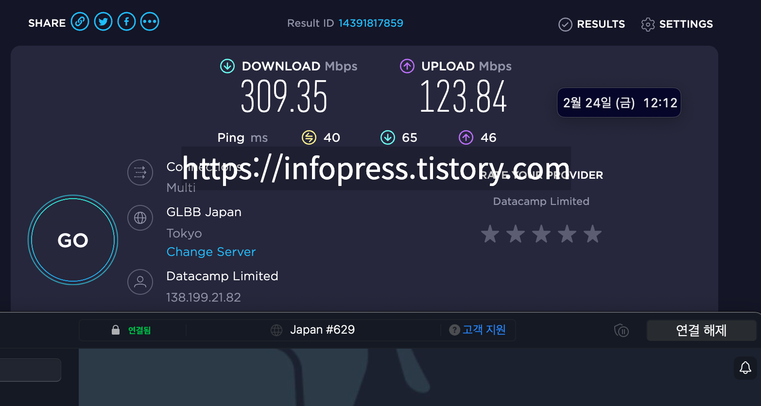 (일본 서버) 금요일 밤인데도 309.35Mbps가 나왔고, 400~450Mbps 구간도 자주 구경할 수 있습니다.