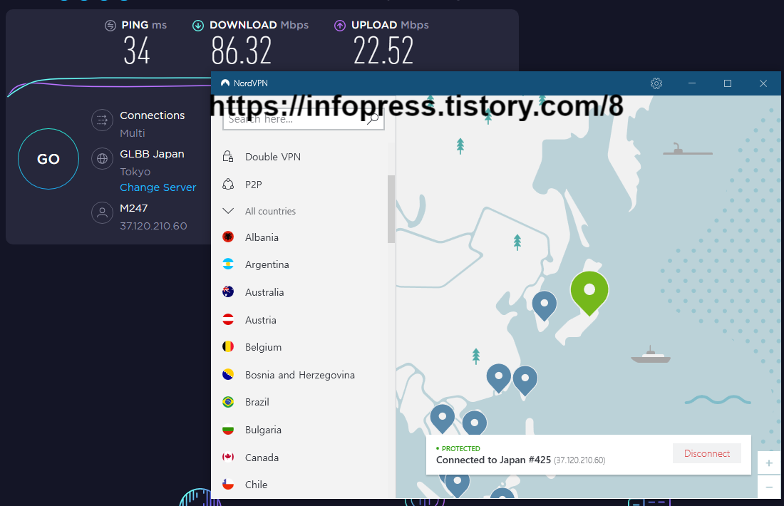 일본 서버 접속시 핑 34 / 다운로드 : 86.32Mbps / 업로드 22.52Mbps