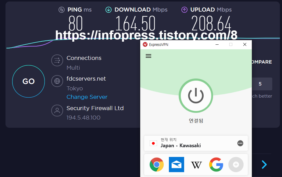 ExpressVPN 일본 VPN : 핑 80 / 다운로드 : 164.50Mbps / 업로드 208.64Mbps