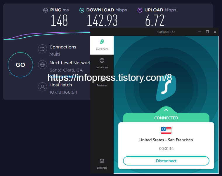 SurfShark 미국 VPN 스피드 : 핑 148ms / 다운로드 : 142.93Mbps / 업로드 6.72Mbps