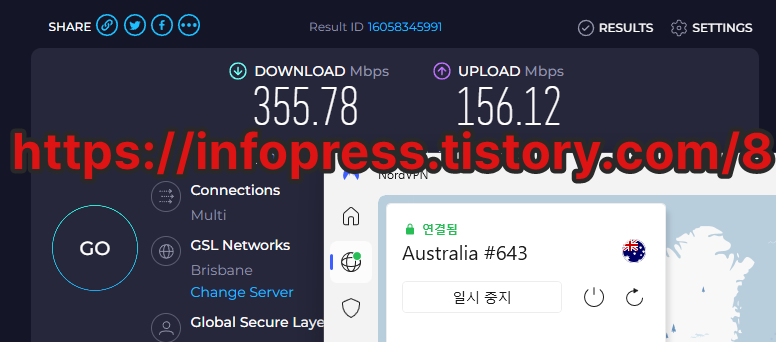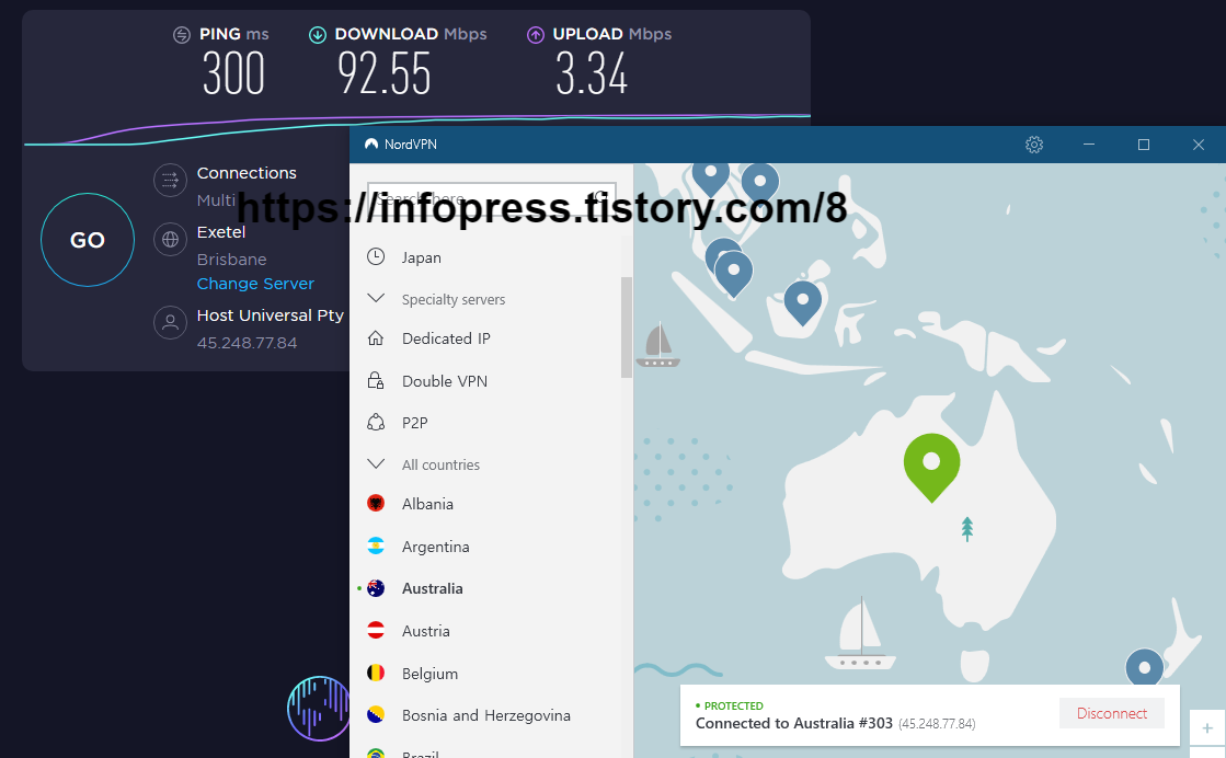 Australia(호주) NordVPN 서버 속도 : 핑 300ms / 다운로드 : 92.55Mbps / 업로드 3.34Mbps