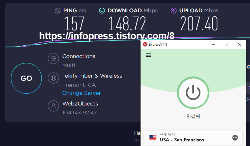 ExpressVPN 미국(San Francisco) VPN : 핑 157 / 다운로드 : 148.72Mbps / 업로드 207.40Mbps