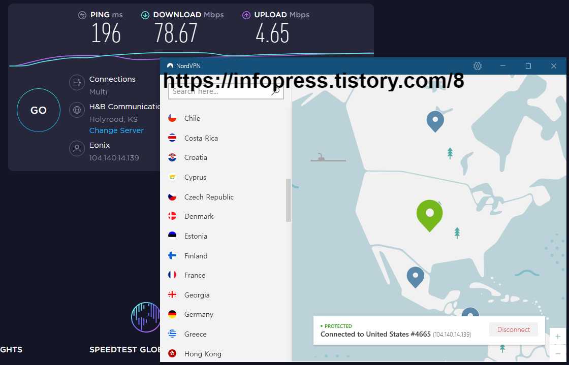 미국 NordVPN 서버 접속 스피드 : 핑 196ms / 다운로드 : 78.67Mbps / 업로드 4.65Mbps