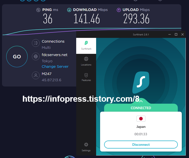 SurfShark VPN 일본 서버 속도 : 핑 36ms / 다운로드 : 141.46Mbps / 업로드 293.36Mbps