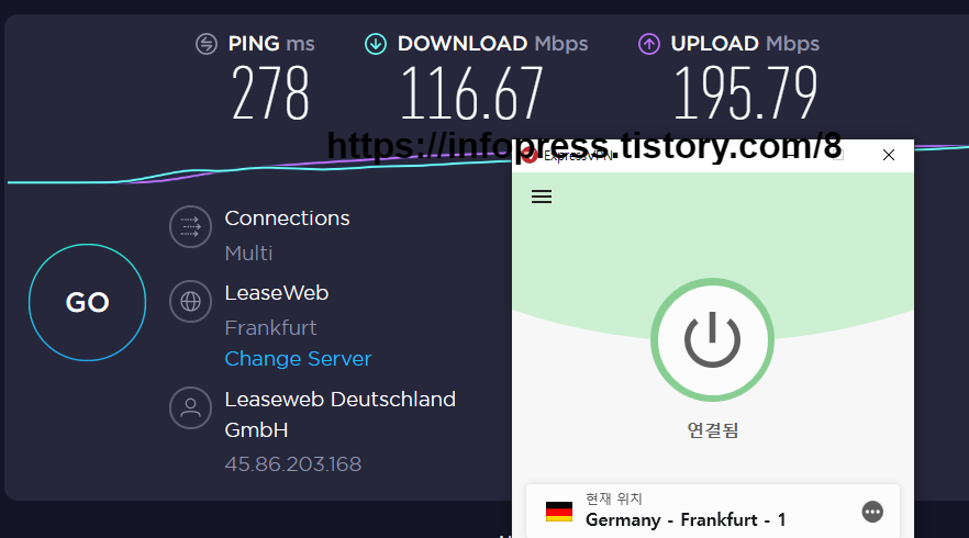ExpressVPN 독일 VPN : 핑 278 / 다운로드 : 116.67Mbps / 업로드 195.79Mbps